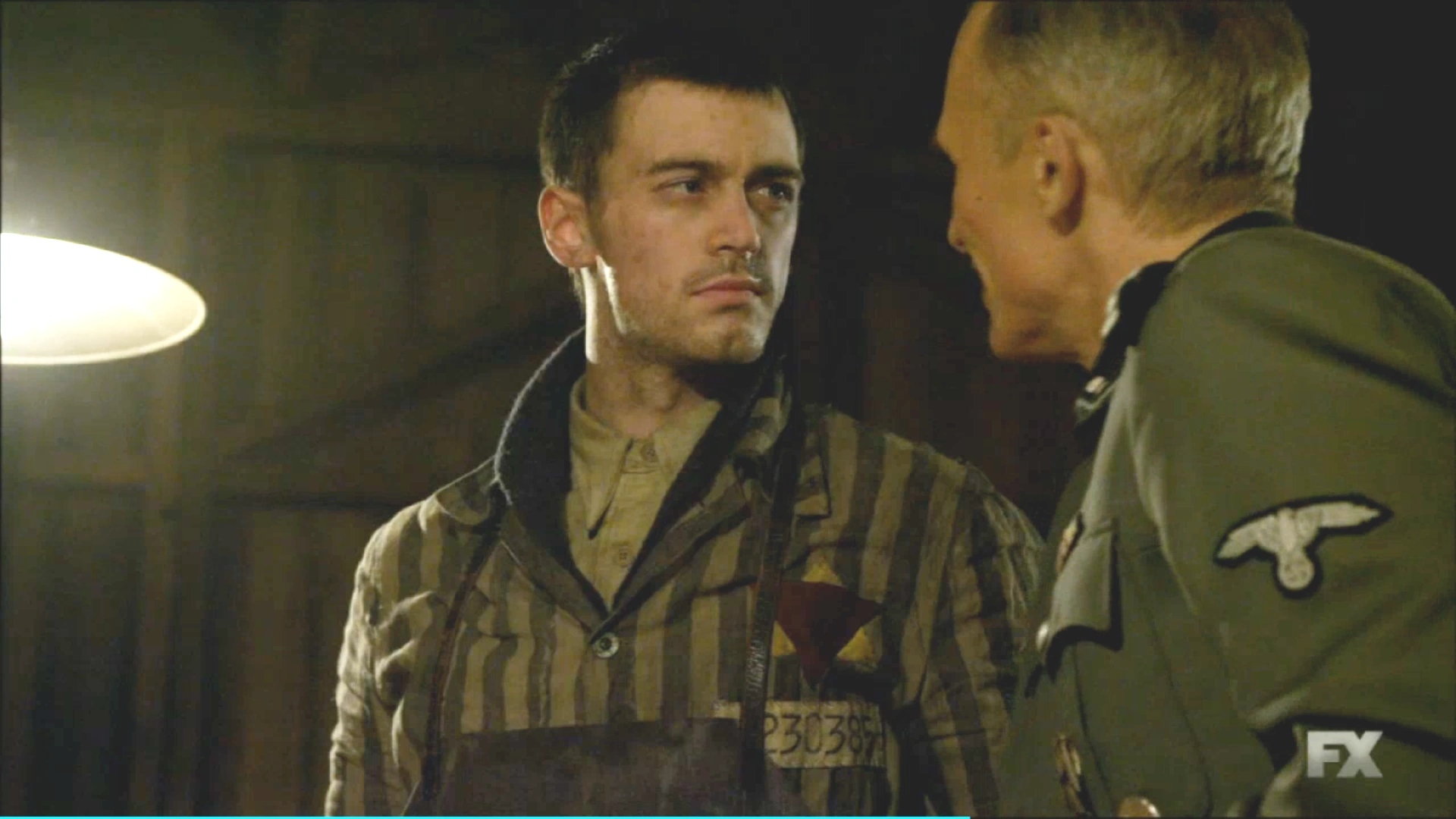 Young Abraham Setrakian during his time in the camps. Setrakian has a Star of David sewn into his shirt, composed of a yellow triangle and a red triangle. The red triangle indicates him as a political prisoner; the yellow triangle indicates that he is Jewish. Also note the camp serial number directly below the star.